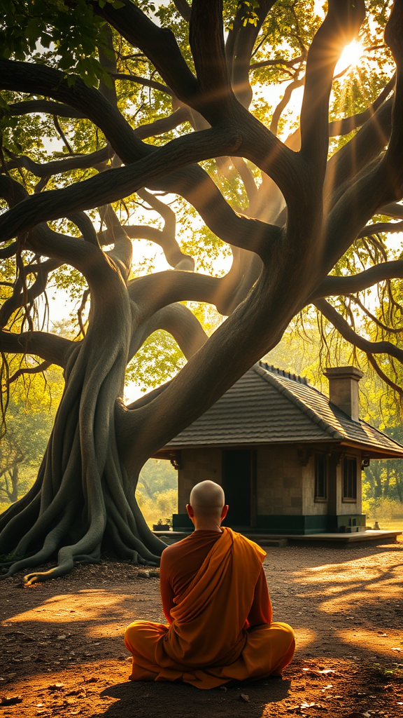 A serene close-up image of a monk deep in meditation beneath an ancient, sprawling banyan tree, its roots weaving intricate patterns in the earth. In the background, an architecturally unique and timeworn retreat cabin sits, constructed of ancient stone and wood, its design whispering secrets of a forgotten era. Soft, holy light filters through the tree's lush canopy, casting a gentle, ethereal glow upon the scene. The golden sunlight bathes the monk and cabin in a mythical aura, blending time and space into a harmonious, transcendent moment.