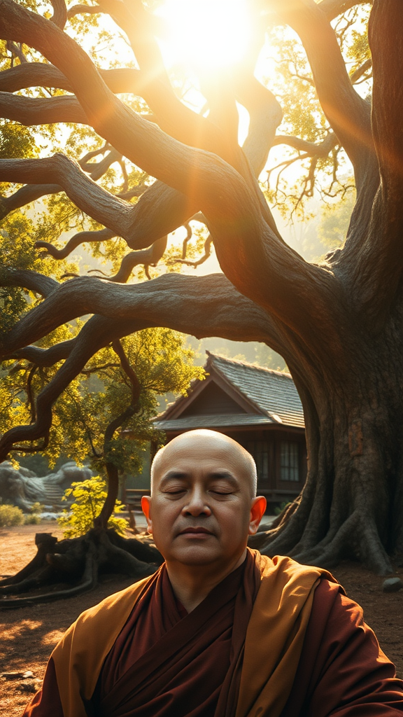A serene close up of a monk deep in meditation beneath the sprawling branches of an ancient, gnarled tree, their features calm and illuminated by a gentle, holy light. Behind them, nestled in the foliage, lies a unique and timeworn retreat cabin, its architecture blending seamlessly with nature, exuding an aura of timeless wisdom. The scene is bathed in golden sunlight, casting an ethereal glow over the landscape, creating a mythical atmosphere that feels both sacred and enchanted.