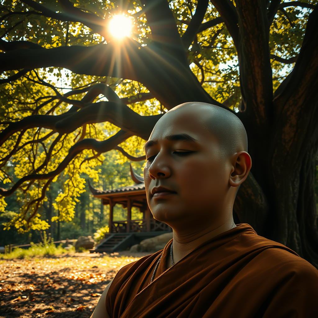 A serene close-up of a monk deep in meditation underneath an ancient, sprawling tree, where dappled golden sunlight filters through the leaves creating a halo of holy light around him. In the background, an enchanting and ancient retreat cabin peeks through the foliage, its intricately carved wood blending harmoniously with the natural environment, giving it a mythical aura. The atmosphere is imbued with a sense of tranquility and timeless spirituality.