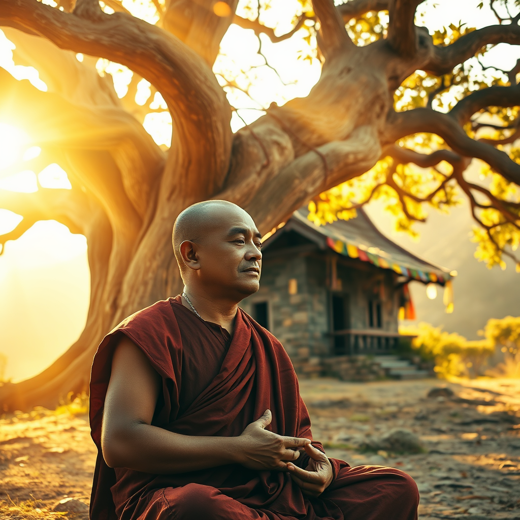 A serene close up of a monk in deep meditation, seated beneath a sprawling, ancient tree whose gnarled branches whisper of centuries past; in the background, a mystical retreat cabin stands, crafted from timeworn stones and covered with twining vines, its roof adorned with colorful prayer flags fluttering gently in the breeze. The scene is bathed in ethereal golden sunlight, creating an aura of holy light that envelops the landscape, casting a warm, mythical glow over the peaceful tableau.