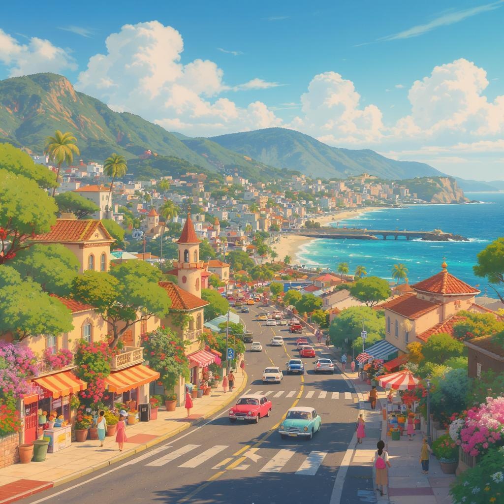 A serene coastal cityscape from the GTA VI trailer transforms into a whimsical Ghibli-style illustration, with vibrant, lush vegetation lining the streets. The bustling urban environment merges with nature as charming, pastel-colored vehicles navigate the winding roads. Soft, warm lighting casts gentle shadows over the quaint buildings, each with unique architectural features reminiscent of a fantastical world. Animated, expressive characters in casual attire go about their daily activities, exuding a sense of adventure and wonder, while fluffy clouds drift lazily in the expansive, clear sky above.