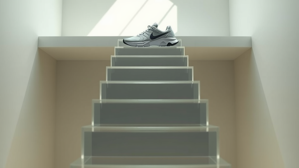 A serene, contrasting scene featuring a set of translucent stairs seemingly suspended in the air, bathed in bright, ambient light. Atop the stairs, a pair of experimental Nike trainers sneakers appear to defy gravity, rendered in intricate detail with Octane. The product design showcases a fusion of modern materials and innovative aesthetics, emphasizing a balance of calmness and energy. The composition evokes a sense of floating tranquility, enhanced by the soft, diffused lighting that highlights the unique textures. A touch of playful unpredictability adds to the allure, creating a visual narrative of movement and possibility.