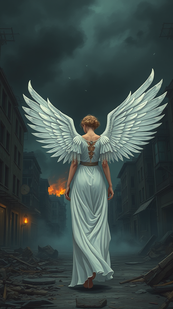 A serene female angel, her large, ethereal white wings gently folded at her back, dressed in a beautifully detailed but tattered white gown, walks through a desolate street lined with crumbling buildings. The sky looms dark and foreboding, casting a somber mood over the scene. Distant fires flicker ominously in the background, their light dancing through thick, curling smoke. The air is thick with volumetric fog, softening the harsh lines of the war-torn landscape. The intricate textures of the scene emphasize the post-apocalyptic devastation, with ambient occlusion highlighting the depth and shadow. Despite the chaos, the illustration retains a dreamlike, surreal quality, merging elements of realism with a cartoonish, painterly style, capturing the haunting beauty amidst ruin and resilience in a world touched by war.