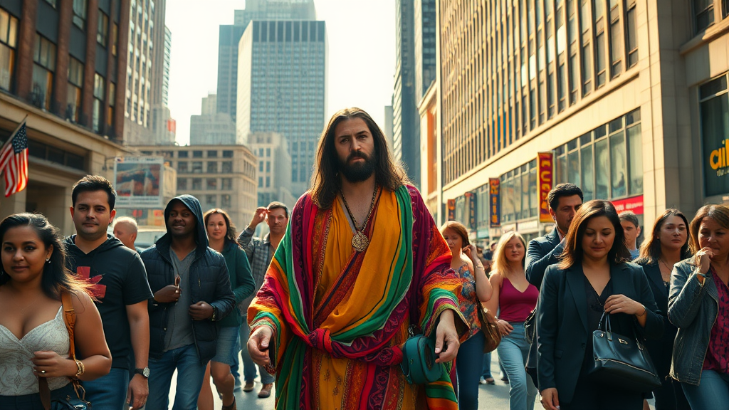 A serene figure resembling Jesus, dressed in vibrant hippie attire, walks through the bustling streets of New York City. Around him, diverse groups of real people go about their daily lives, their expressions a mix of curiosity and nonchalance. The scene captures a cinematic, ultraphotorealistic quality with vivid HDR colors and crisp details as if shot in 8k resolution. Sunlight filters through the towering skyscrapers, casting a warm glow on the busy sidewalk, shadows dancing around this unique and harmonious blend of the past and present.