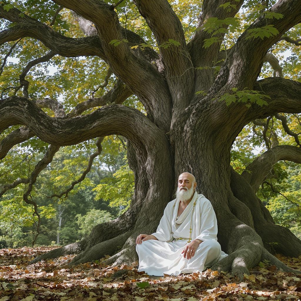 A serene figure sits cross-legged under a sprawling ancient tree, their features radiating tranquility and wisdom, embodying the essence of enlightenment and compassion as the gentle rustling of leaves whispers timeless truths.
