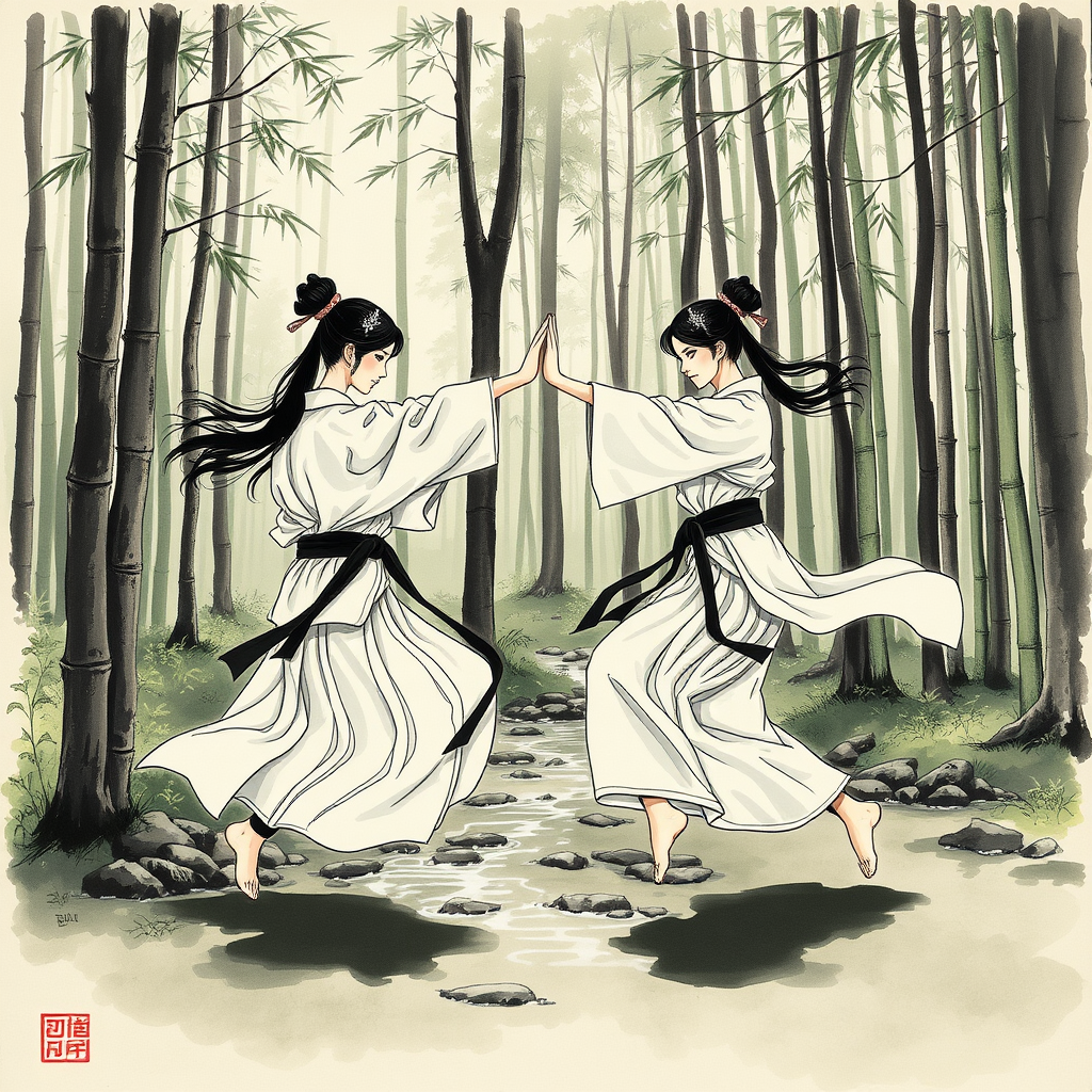 A serene forest scene unfolds where two Japanese women engage in a graceful karate battle, their movements fluid and powerful, captured in the style of traditional Japanese ink painting. The forest backdrop features towering bamboo and gentle streams, creating a harmonious balance between nature and martial artistry. The women are adorned in elegant, flowing kimono that dance through the air with each movement, embodying both strength and grace. The ink strokes convey not only the essence of their fierce yet respectful combat but also the delicate beauty of their traditional attire, blending seamlessly with the tranquil landscape.