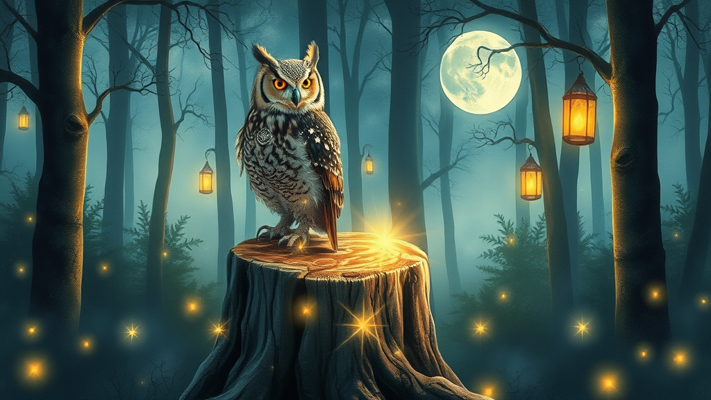 A serene forest scene where a regal owl with celestial constellations etched into its feathers perches on a glowing, ancient tree stump, surrounded by luminescent fireflies and shimmering, misty moonlight, with mystical floating lanterns casting a soft, mesmerizing glow in the background; rendered in a dreamlike watercolor style, combining elements of fantasy and nature with a touch of ethereal charm.