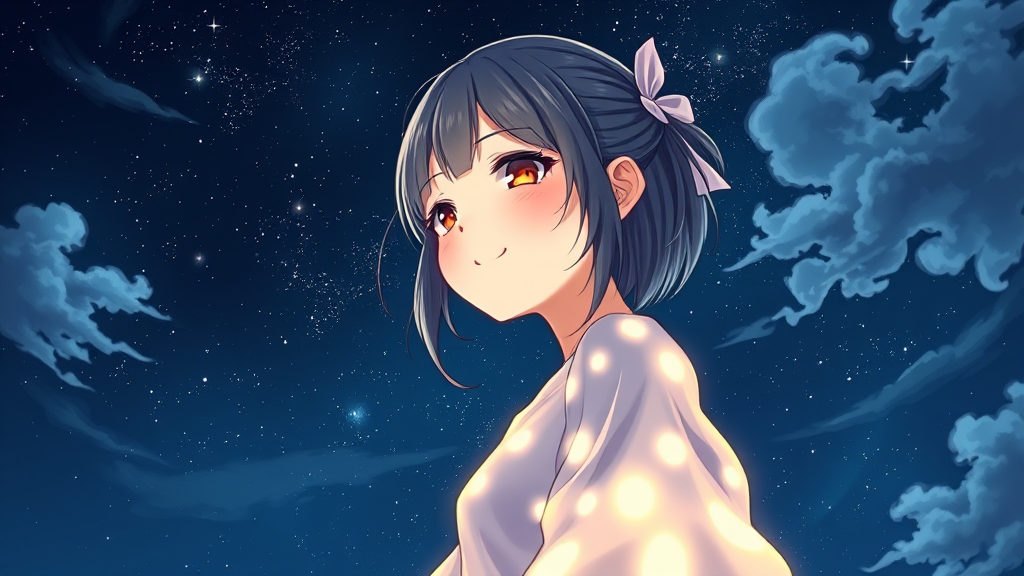 A serene girl dressed in luminous attire, evoking the essence of Oyari Ashito's artistic style, stands gracefully against a starlit night sky. Her expression radiates pure satisfaction and enjoyment, captured in a portrait that blends manga graphics and anime aesthetics. The scene is artfully drawn with dark exposure and striking bright colors, showcasing the highest quality and detail. From a first-person perspective, the composition features rich, dark tones interwoven with soft, drifting clouds, encapsulating the tranquil beauty of the night.