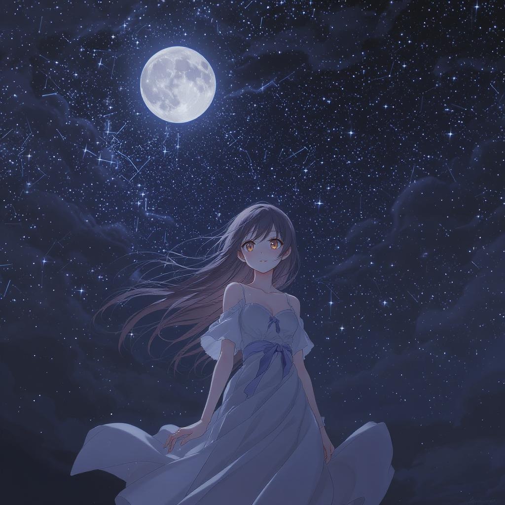A serene girl in light, ethereal clothing stands against a backdrop of a starlit summer night sky, capturing a sense of innocence and dreaminess. Her expression, bathed in the soft glow of moonlight, reflects a tranquil state, mirroring the essence of manga and anime art styles. Dark tones envelop her, contrasting beautifully with bursts of vibrant colors in her attire and the twinkling stars. Clouds drift subtly above, adding a layer of depth and mystery. The portrait, rendered with meticulous detail and high-quality graphics, offers an intimate first-person perspective, immersing the viewer in an atmosphere of peace and wonder.