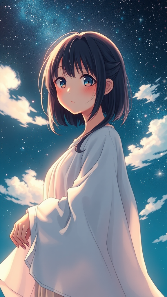 A serene girl in light, flowing attire stands gracefully against a backdrop of a starry summer night sky, embodying innocence and dreaminess. The scene is reminiscent of Oyari Ashito's artistic style, capturing the essence of manga and anime with meticulous detail. Her expression radiates calmness amidst the dark exposure, while bright colors blend harmoniously with deep, contrasting tones. Wisps of clouds surround her, enhancing the magical ambiance. This portrait reflects the highest quality and attention to detail, capturing a moment of tranquil beauty from a first-person perspective.