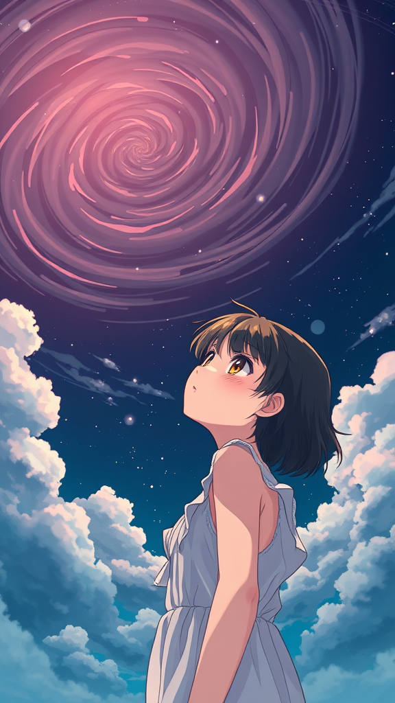 A serene girl in light summer attire gazes into the expansive night sky, capturing the essence of innocence and dreaminess. Illustrated in the charming manga style reminiscent of artist Oyari Ashito, this portrait showcases a first-person view with rich, dark tones contrasted by vividly bright colors. Amidst a backdrop of swirling clouds, her expressive eyes convey tranquility and curiosity. The scene reveals intricate details and a high-quality finish, revealing the quiet magic of a summer night under the cosmos.