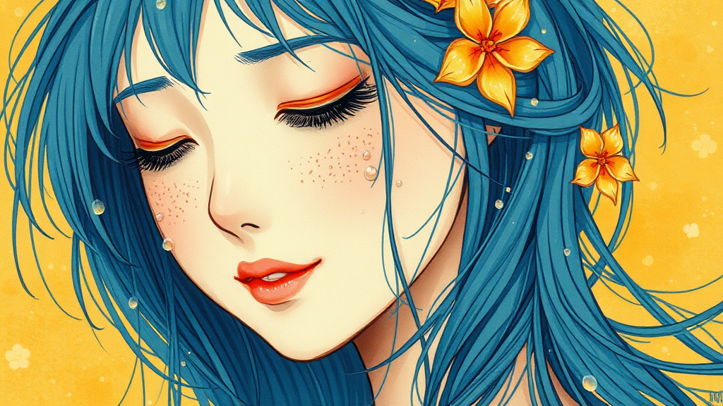 A serene girl with blue hair and eyes gently closed, captured in the ethereal style of the Stars Art Group, bathed in hues of yellow and orange. Delicate water droplets adorn her visage, nestled within a romantic illustration. Intense lines weave through the composition, blending the meticulous detail of Gongbi with the fluidity of loose paint application, creating an evocative and dreamy scene.