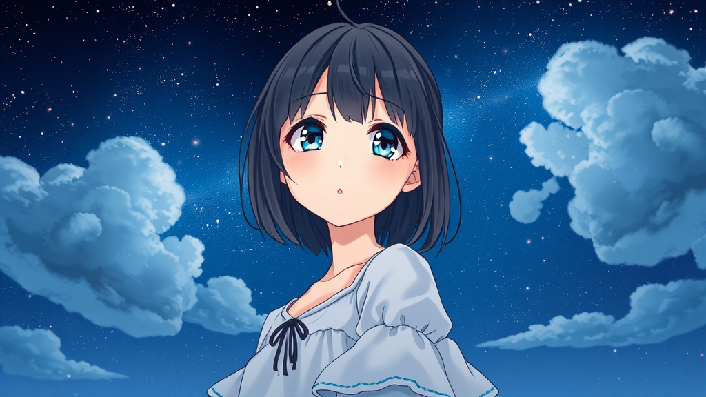 A serene, innocent girl in delicate attire stands against a starry summer night sky, inspired by the artistic style of Oyari Ashito. The portrait captures her dreamy expression in a first-person perspective, blending manga graphics with anime influences. The image features a rich interplay of dark exposure and vibrant colors, emphasizing the quiet beauty of the scene. Dark tones contrast with bright elements, as soft clouds drift across the backdrop. The composition radiates a sense of calm and wonder, focusing on the highest quality and detail, maintaining the core essence of serenity and dreaminess the original prompt embodies.