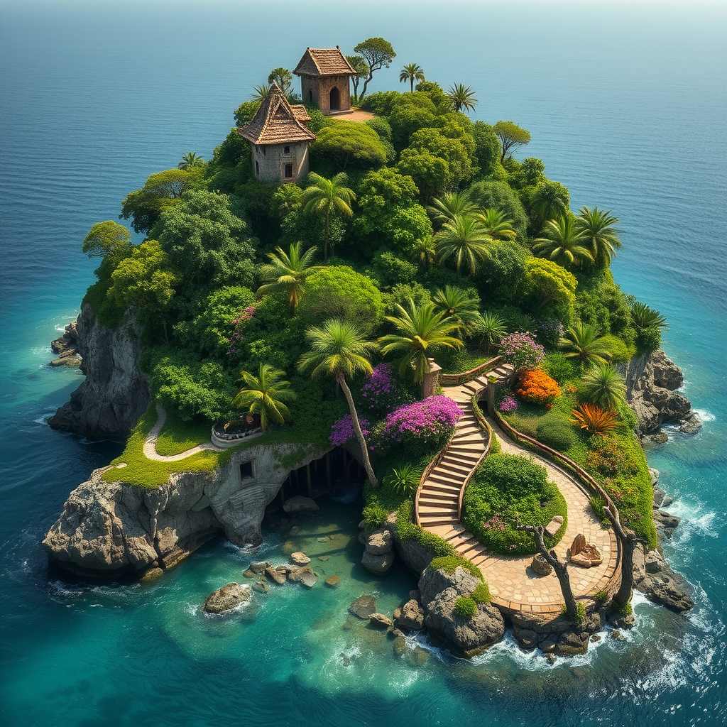 A serene island where time seems to stand still, with lush greenery and vibrant flowers, inviting travelers to explore hidden pathways and discover ancient secrets whispered by the ocean breeze.