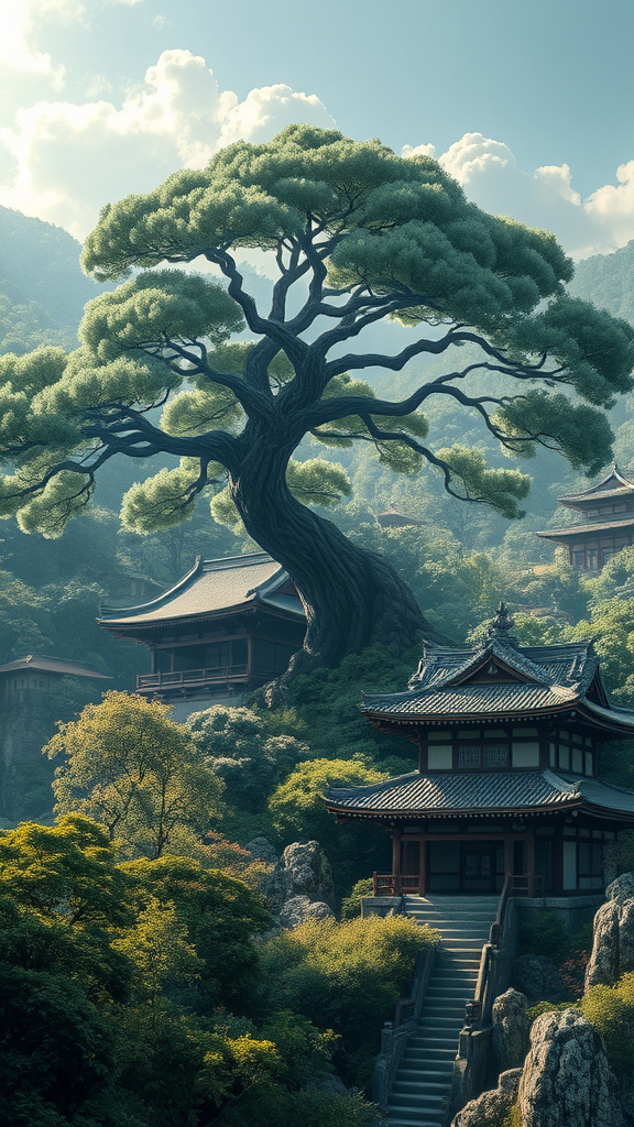 A serene Japanese landscape featuring two intricately designed temples nestled among lush foliage, capturing the essence of traditional architecture with modern fantasy lighting. The scene is enhanced by a single grand tree, its branches gracefully arching over the temples, casting dynamic shadows that dance in the ethereal light. The artwork is rich in detail, with textures and colors vividly portrayed, evoking a sense of tranquility and wonder. Ideal for showcasing on art platforms, with a wide aspect ratio to emphasize the breadth and elegance of the scene.