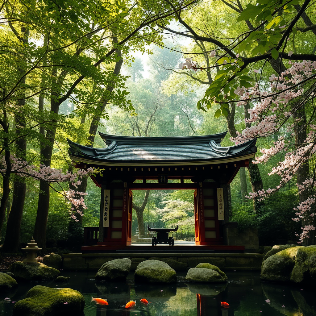 A serene Japanese shrine nestled within a lush forest, with intricately carved wooden details and traditional red torii gates, surrounded by a tranquil koi pond. Soft rays of sunlight filter through the dense canopy, casting dappled light on the moss-covered stones. Cherry blossom petals gently float in the breeze, adding a touch of delicate pink to the verdant landscape, with an air of ancient tranquility and spiritual harmony.