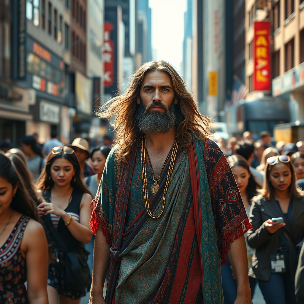A serene Jesus, adorned in colorful bohemian attire, strolls through the bustling streets of New York City, harmonizing ancient wisdom with modern urban life. With a calm expression and flowing hair catching the sunlight, he moves amidst the diverse crowd, who are captured in mid-motion, their everyday activities framing this extraordinary scene. The vibrant city pulses around him in ultraphotorealistic detail with each passerby's unique features illuminated, embodying the dynamic spirit of the metropolis in a cinematic, 8k resolution. The essence of an unexpected convergence between iconic historical presence and contemporary reality is vividly portrayed.
