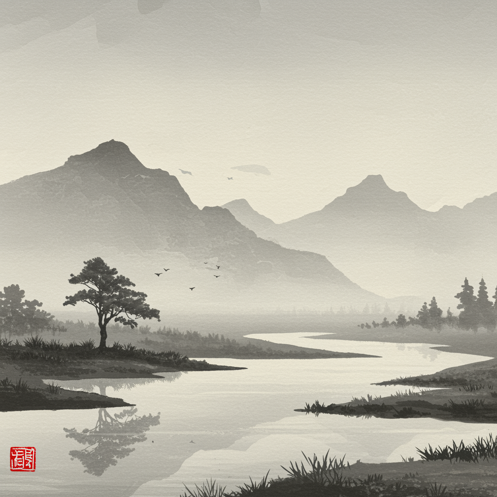 A serene landscape emerges, captured in the delicate strokes of suibokuga. Towering mountains, shrouded in mist, rise in the background, their gray tones blending with the sky. A tranquil river winds through the scene, its gentle flow reflecting the subtle play of light and shadow. In the foreground, a solitary tree stands gracefully by the water's edge, its branches extending like delicate calligraphy. Small touches of ink give life to distant birds soaring in the vast, expansive sky, adding a sense of freedom and peace to the tranquil setting.
