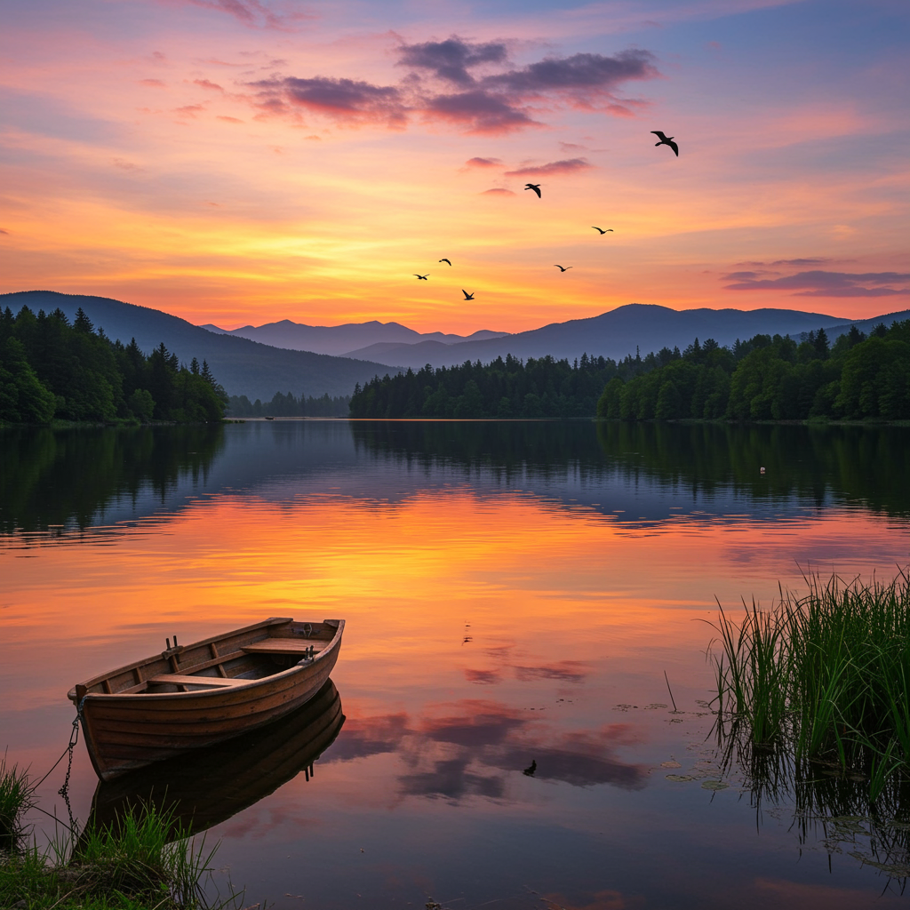 A serene landscape featuring a tranquil lake reflecting the vibrant hues of a sunset sky, surrounded by lush green forest, a small wooden boat gently floating near the shore, and distant mountains silhouetted against the colorful horizon, adding a few playful birds soaring across the sky.