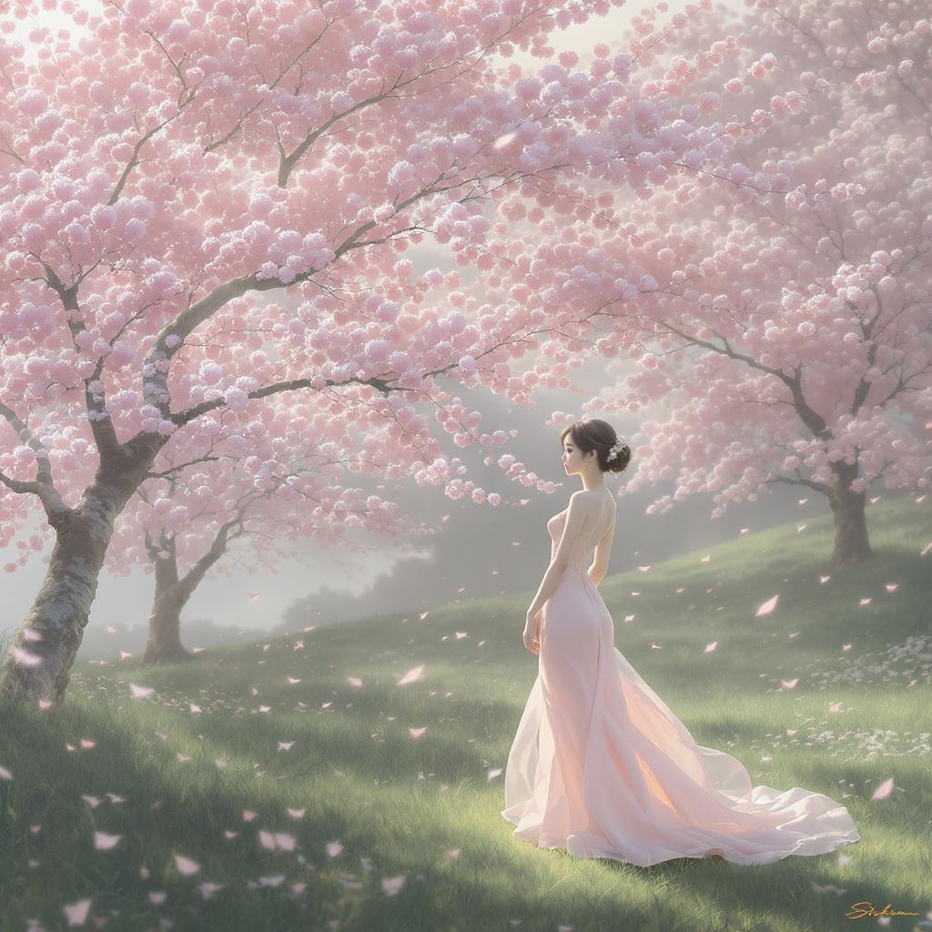 A serene landscape of cherry blossoms with delicate pink flowers embodying tranquility and beauty. In the foreground, an elegantly rendered 3D model of a woman adds a vibrant contrast to the gentle scene. Her presence, though striking, harmonizes with the peacefulness of the blossoms. The setting is captured with artistic flair, highlighting the intricate details of both the environment and the woman. The composition maintains the essence of serenity and visual splendor, ensuring a captivating and immersive visual experience.