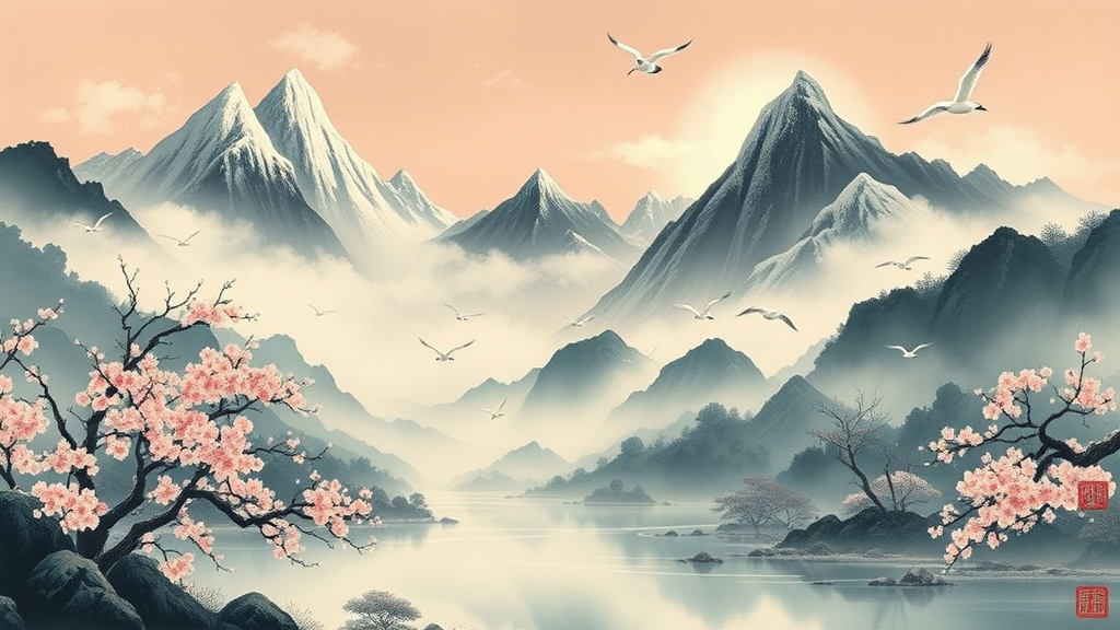 A serene landscape painted in the style of suibokuga, depicting towering mountain peaks covered in mist, delicate cherry blossoms scattered throughout the scene, a calm river flowing gently in the foreground, and cranes gracefully flying above, all rendered with a heightened sense of stylization and artistic flourishes, showcasing delicate brushwork and a harmonious balance between light and shadow, capturing a timeless and tranquil atmosphere.