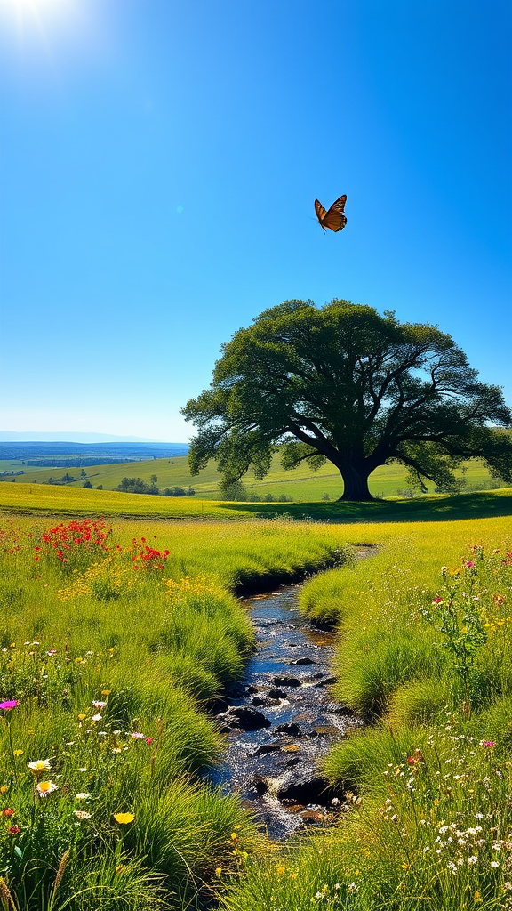 A serene landscape under a clear blue sky, showcasing a lush meadow dotted with vibrant wildflowers. In the foreground, a small brook winds its way through the grass, reflecting the sunlight in twinkling hues. Majestic oak trees provide patches of shade, their leaves rustling softly in the gentle breeze. In the distance, low rolling hills stretch out towards the horizon, covered in a rich tapestry of green with hints of gold from the sun. The scene conveys a sense of peace and rejuvenation, inviting onlookers to pause and breathe in the fresh air, as a single butterfly flutters gracefully across the view.