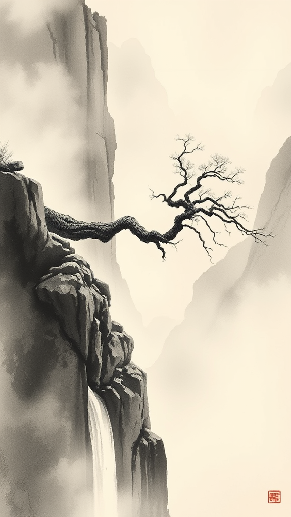 A serene landscape unfolds in the delicate strokes of suibokuga, capturing high cliffs shrouded in mist, with a gnarled, ancient tree perched precariously on a rocky ledge. The composition, tall and elegant, contrasts the ruggedness of nature against the fluid elegance of ink, echoing a sense of timelessness and tranquility. Subtle variations in tone depict the shifting shadows and ethereal light of dawn, as whispers of a hidden waterfall lend a gentle rhythm to the scene.