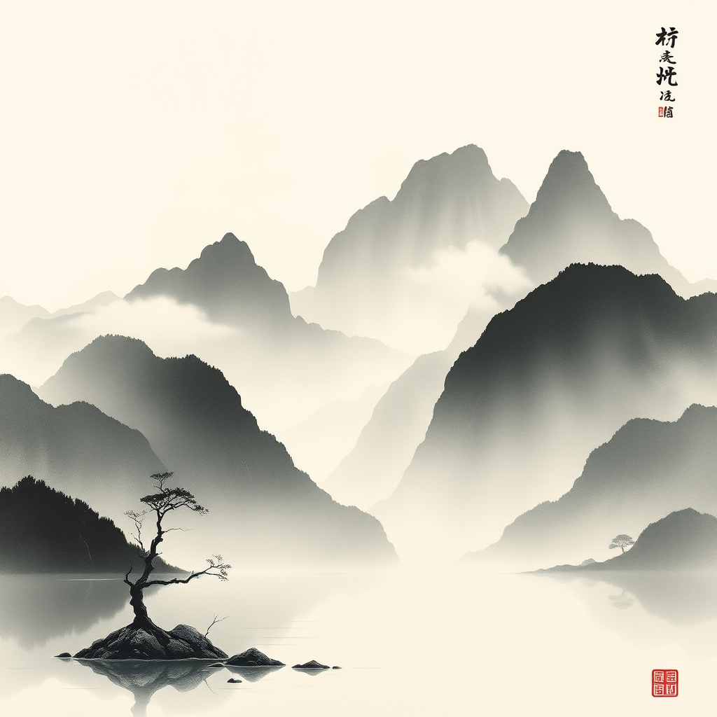 A serene landscape unfolds, reminiscent of ancient suibokuga artwork, capturing misty mountains shrouded in delicate layers of ink wash. The composition holds a vertical perspective, emphasizing the towering peaks that fade gracefully into the sky. Subtle brushstrokes depict tranquil waters reflecting wisps of cloud, while a lone tree stands resilient against the gentle wind. Bathed in a mystical ambiance, this scene invites reflection and a sense of timelessness, merging traditional style with a hint of modern elegance.