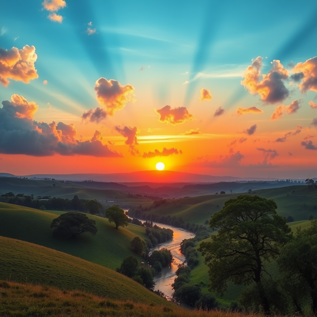 A serene landscape unfolds with rolling hills and a vibrant, colorful sky, where the sun gently dips below the horizon casting a warm glow over the lush greenery and a tranquil river weaving through the scene. Fluffy clouds float lazily above, and a gentle breeze rustles the leaves of majestic trees scattered across the land.