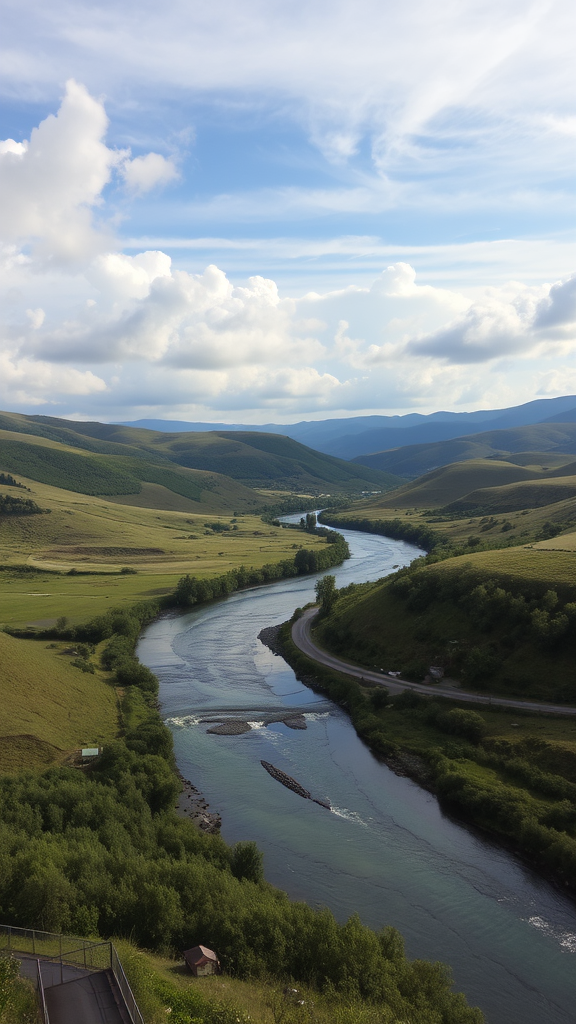A serene landscape with rolling hills and a crystal-clear river winding through lush greenery, under a vibrant sky with soft, fluffy clouds casting gentle shadows on the earth, capturing the essence of tranquility and natural beauty.