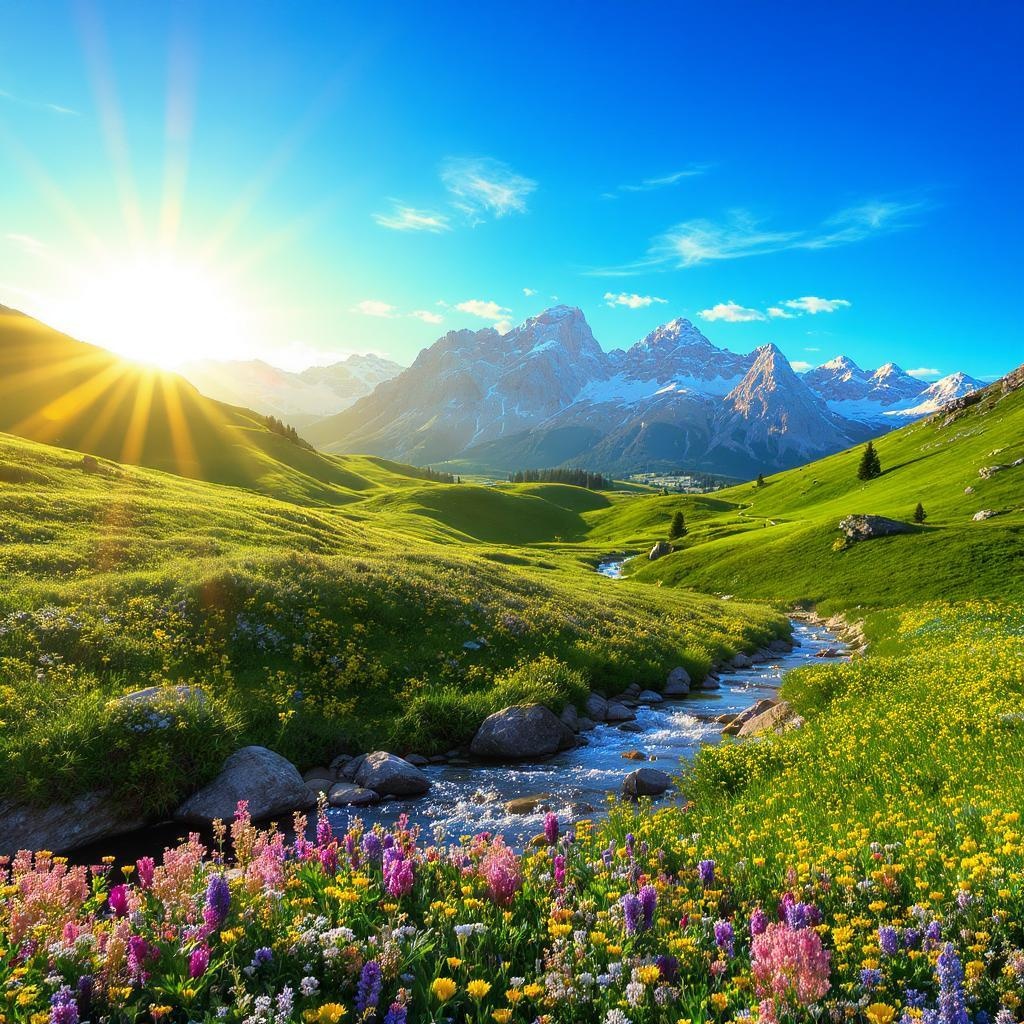A serene landscape with rolling hills bathed in golden sunlight, dotted with wildflowers and a crystal-clear stream gently weaving through the scene; a distant mountain range serves as an awe-inspiring backdrop under a vibrant azure sky.