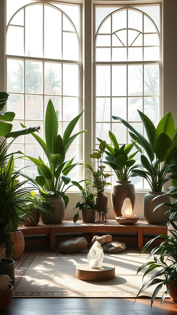 A serene meditation space featuring a zen-inspired room adorned with an abundance of lush indoor plants, curated crystals that emit calming energy, and architectural elements that embrace tranquility. The ambiance is enhanced with soft natural light filtering through elegant, large windows, casting gentle shadows. The hyperrealistic setting captures the essence of peacefulness with a cinematic 8k ultra hd quality, inviting a sense of deep relaxation and mindfulness.