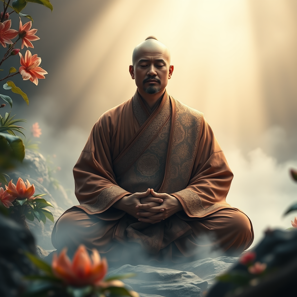 A serene monk clad in an intricate robe sits in a lotus pose, immersed in prayer, set in a mystical landscape inspired by Fang Congyi's fantasy art; the scene is cinematic, with rich details and a depth of field that highlights the profound serenity and wisdom radiating from his expression. Exotic flora subtly frames the composition, while soft beams of light filter through ethereal mists, creating an atmosphere of tranquil spirituality.