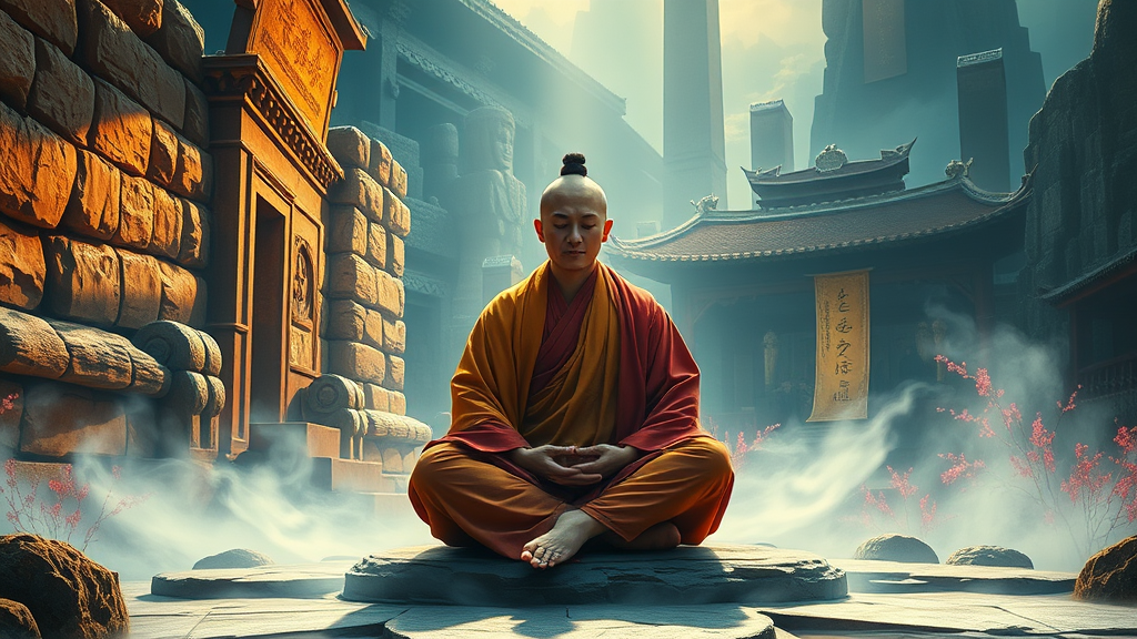 A serene monk in a flowing robe meditates in the lotus pose, inspired by Fang Congyi, set within a fantastical and cinematic realm, featuring intricate details and a gentle play of focus. Warm light cascades around him, casting elusive shadows on ancient stone walls, as ethereal mist swirls gently at his feet. The surrounding landscape is alive with vibrant colors and mythical motifs, lending an air of mysticism and tranquil grandeur to the scene.
