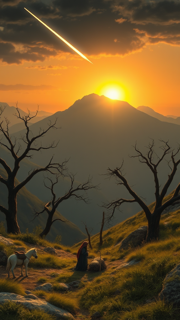 A serene nativity scene envisioned by Caspar David Friedrich, infused with elements from his iconic landscapes. In the warm glow of the setting sun behind soft, rolling mountains, a luminous comet streaks across a darkening sky, casting an ethereal light over the Eastern landscape. Instead of snow, the earth is adorned with lush grasses and barren, ancient trees forming a natural frame. In the foreground, the nativity figures are nestled gently amidst the landscape, their serene presence harmonizing with the timelessness of their surroundings. The atmosphere is both mystical and peaceful, capturing the sacred moment with Friedrich's trademark romanticism.