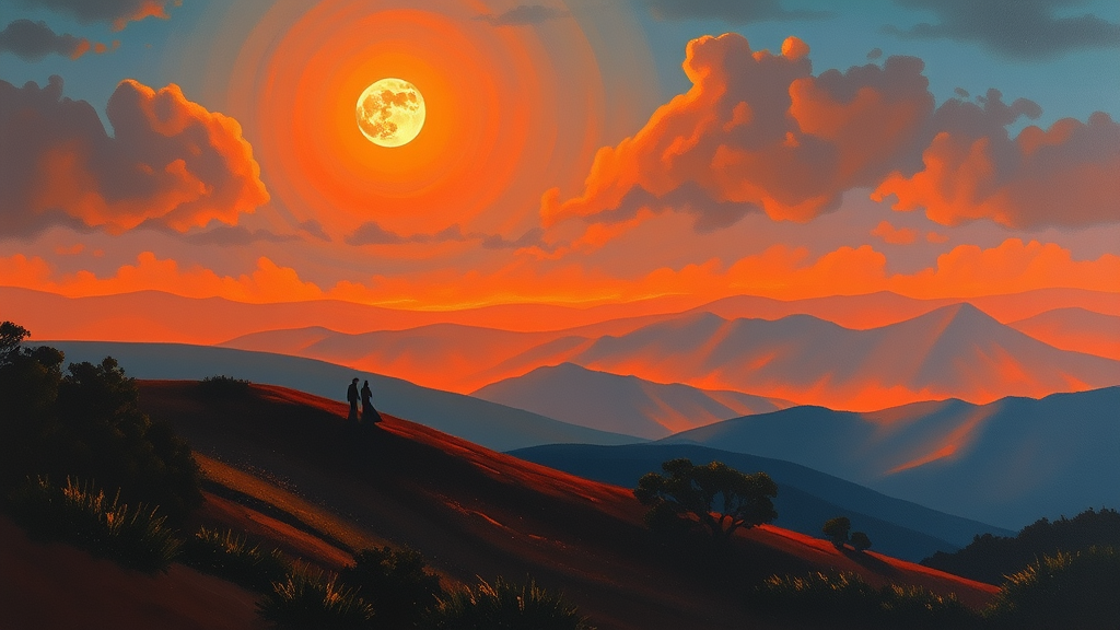 A serene nocturnal scene where the moonlight blooms across a sweeping landscape, casting an ethereal glow. The style echoes Bay Area Figurative Art with a hint of realism, blending vibrant oranges and deep blues. Figures are subtly incorporated within the moving landscape, reminiscent of Whistler's soft brushwork, infused with ancient Phoenician influences. The painting is rich with crimson shadows and illuminated blues, capturing a harmonious dance of color and form.