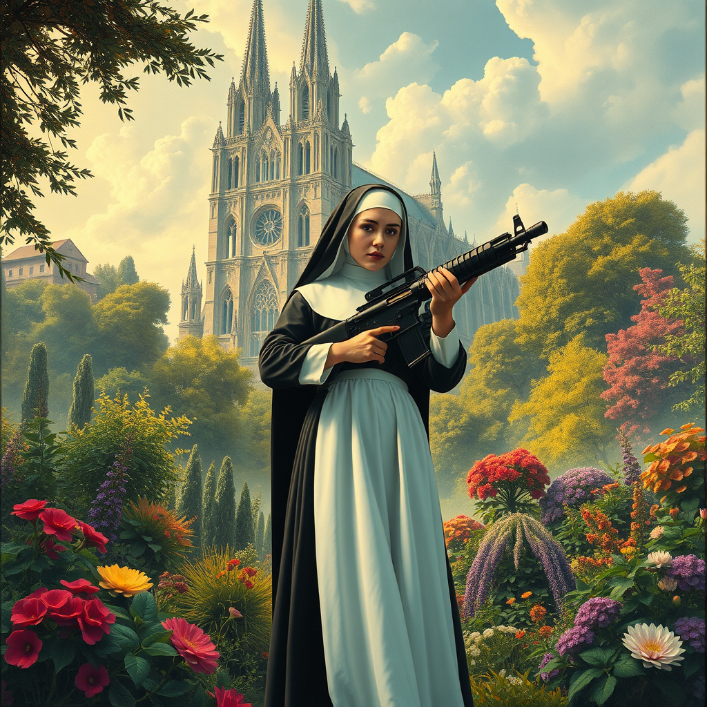 A serene nun gracefully wielding an imposing machine gun, standing amidst lush gardens with an ancient cathedral looming in the ethereal background; the scene blends surrealism and fantasy, evoking a dreamlike aura reminiscent of Die Brücke's expressive style - all captured in vibrant colors and surreal details that blur the line between reality and imagination.