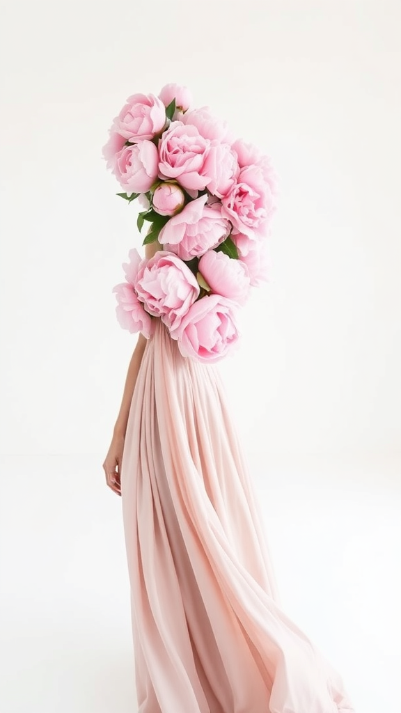 A serene photograph of a woman in a flowing dress, her head adorned and obscured by a lush bouquet of pink peonies, set against a minimalist white room, where the absence of objects highlights the intricate details of the flowers and fabric.