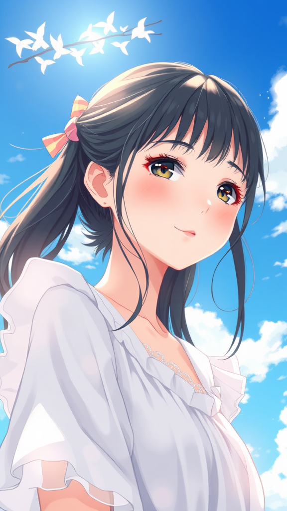 A serene portrait of a girl in airy attire, reminiscent of Oyari Ashito’s style, set against a bright blue sky on a sunny day. The artwork captures her innocence with manga-inspired graphics and anime aesthetics, showcasing soft light exposure and delicate highlights. The scene is depicted in the highest quality and detail, viewed from a first-person perspective with an emphasis on light tones. Natural lighting bathes her features, enhancing her graceful presence amidst gentle, fluffy clouds.