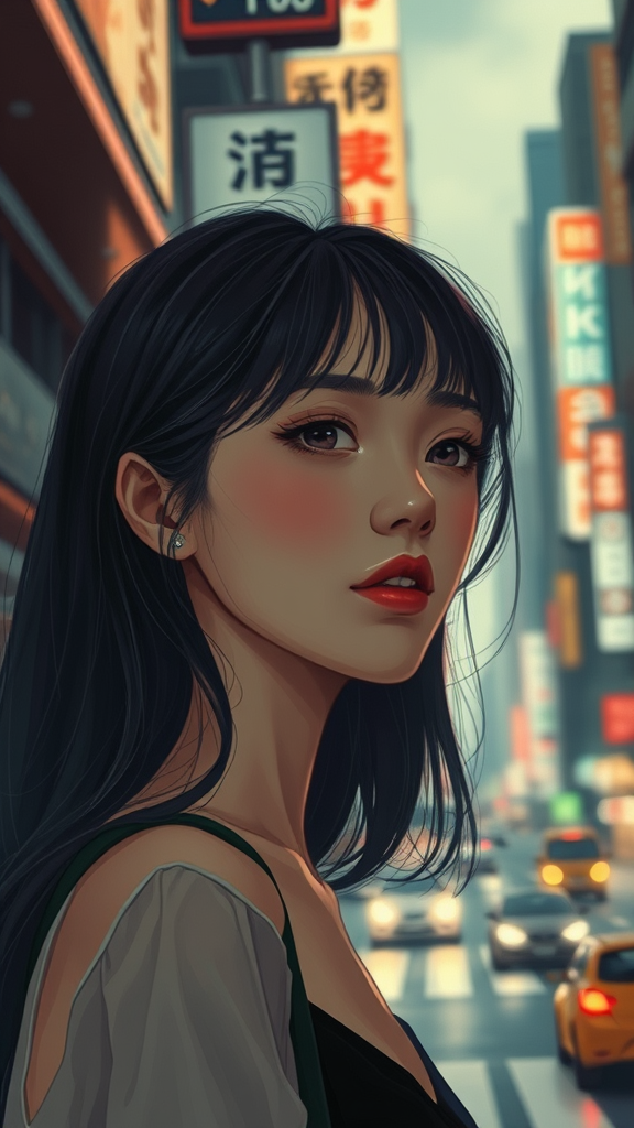 A serene portrait of a woman against the bustling streets of Tokyo, captured in the distinctive style of Stefan Kostic, Andre Kertesz, and Masamune Shirow, blending illustration and artstation aesthetics. The scene is infused with a synth vibe and enveloped in moody lighting that enhances the tranquil and calm atmosphere. The composition employs a telephoto lens effect, presenting a faded and slightly blurry background that accentuates the woman's peaceful presence amidst the vibrant cityscape.
