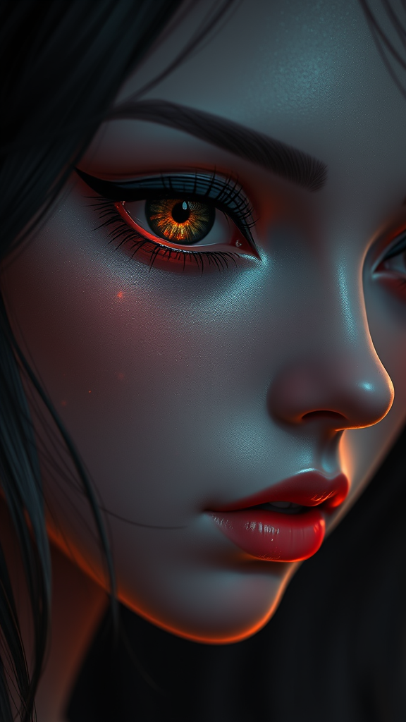A serene portrayal with an intricate face and expressive, detailed eyes, the art showcases a smooth, lustrous skin texture in an anime-inspired style. The scene is captured in digital art with subtle glow effects, blending the essence of hand-drawn techniques with modern rendering through octane and cinema 4d. The atmosphere is dark and atmospheric, offering a cinematic sensuality in 4k ultra detail with sharp focus and hyperrealistic depth of field. A masterpiece of vivid colors and concept art, it draws influence from the works of Ed Blinkey, Atey Ghailan, and Studio Ghibli, trending on platforms like ArtStation and CGSociety. The depiction maintains a high level of intricacy and detail, reflecting dramatic and photorealistic elements that are inspired by the styles of Jeremy Mann, Greg Manchess, and Antonio Moro, all rendered in 16k UHD HDR10 to enhance the vivid artistry.