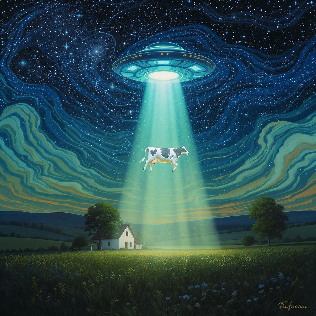 A serene rural farmhouse sits peacefully beneath a starlit sky, where an ethereal UFO casts a gentle, otherworldly glow over the landscape. Suspended mid-air, a cow hovers gracefully in the beam of light, surrounded by a dreamlike aura that blurs the line between reality and fantasy. The scene is infused with a zen-like tranquility, reminiscent of a Die Brücke painting, transcending the ordinary with surreal and vibrant colors. In this fictional and photorealistic landscape, a sense of harmonious wonder prevails, as if inviting the viewer to ponder the mysteries of the universe.
