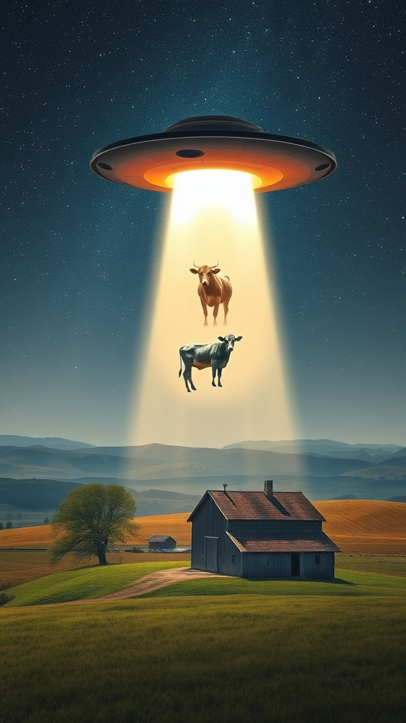 A serene rural farmhouse sits quietly beneath a starlit sky, where a shimmering, ethereal, and otherworldly beam descends from a sleek, disc-shaped UFO. In the beam, a cow hovers gracefully, bathed in the luminous glow that gently bends the surrounding reality. The scene captures a harmonious blend of otherworldly and earthly elements, evoking the tranquility of zen buddhism amidst the vivid colors and dynamic forms reminiscent of die brücke. The landscape, with its dreamlike and surreal quality, feels like a canvas painted with a rich palette of emotions and hues, merging the boundary between fiction and reality. The surrounding countryside unfolds with rolling hills and whispering winds, while the farmhouse stands as a symbol of quiet resilience in the face of fantastical occurrences.