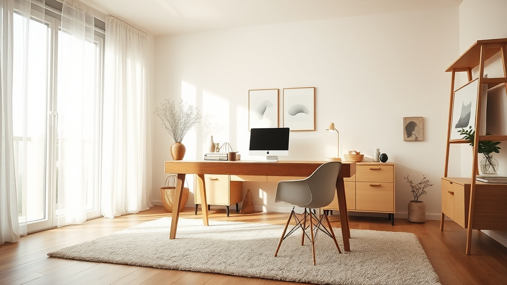 A serene Scandinavian-inspired home office featuring a natural oak desk sits bathed in a warm glow, with ambient lighting streaming from an expansive floor-to-ceiling window. The view is captured from a low angle to highlight the airy spaciousness and abundance of subtle details. Soft, diffused studio light blends seamlessly with gentle sunlight, casting delicate shadows that enhance the room’s tranquility. The scene incorporates a plush Scandinavian-style rug and minimalist decor, adding to the inviting and functional atmosphere of this ultra-realistic workspace.