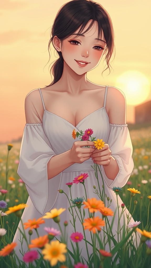 A serene scene of a beautiful woman picking flowers in a meadow during a summer dawn, inspired by Ken Sugimori's anime style. The focus is on her joyful expression and elegant posture as she delicately gathers vibrant blooms. The background captures the soft, golden hues of the rising sun, casting a warm glow over the landscape. While maintaining an anime aesthetic, ensure all features are realistic and the anatomy is accurately portrayed, avoiding any distortions or anomalies. The scene is peaceful and harmonious, emphasizing natural beauty without any distractions or imperfections.
