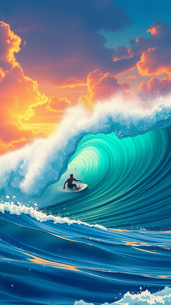 A serene scene of a man surfing a majestic wave in Bali, inspired by the enchanting style of Miyazaki, reminiscent of the lush, adventurous world of Nausicaa Ghibli and the expansive landscapes of Breath of The Wild, where vivid colors blend seamlessly with the ocean's spray and the gentle touch of the sun's rays.