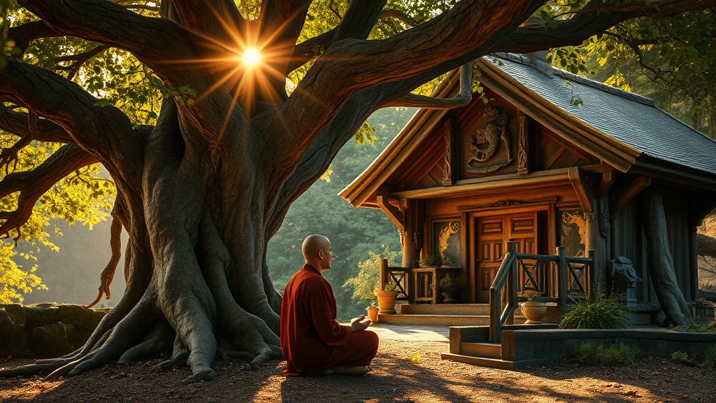 A serene scene of a monk in deep meditation beneath a gnarled, ancient tree, its roots intertwining with earth and wisdom. In the background, a mystical retreat cabin stands, its architecture echoing centuries past, crafted from weathered wood and adorned with intricate carvings of mythical creatures. The air sparkles with a holy light as golden sunlight filters through the leaves, casting a warm, ethereal glow. An aura of tranquility envelops the scene, as if time itself pauses to honor the sacred moment.