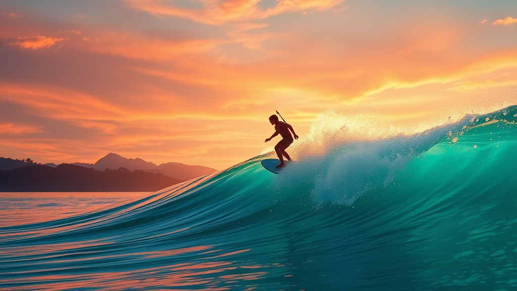 A serene scene unfolds as a man gracefully surfs on a majestic wave in the crystal-clear waters of Bali. The vivid scenery, reminiscent of a Miyazaki film, brings to life the enchanting essence of Nausicaa and the fluid animation style of Ghibli. The landscape is lush and vibrant, echoing the awe-inspiring wilderness found in the world of Breath of The Wild. The sky, painted in warm hues of twilight, reflects on the water, creating a dreamlike atmosphere. The surfer, balanced and at peace, is silhouetted against this breathtaking backdrop, harmonizing with nature's rhythm.