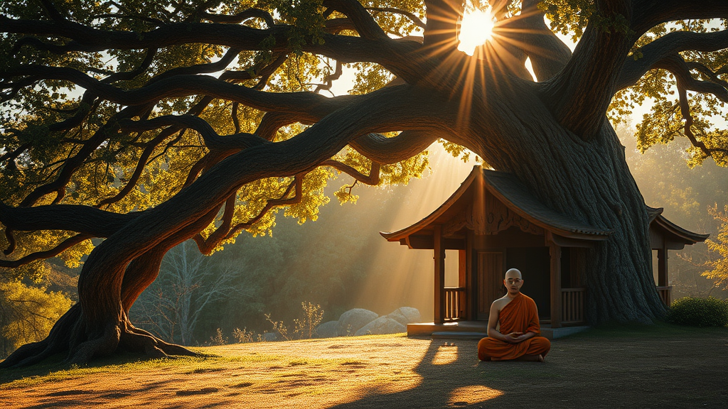 A serene scene unfolds as a monk sits in deep meditation beneath a sprawling, ancient tree, the leaves whispering secrets of the past. In the background, an intricately carved, unique retreat cabin stands gracefully, its wood weathered by time yet imbued with a sense of sacredness. Golden sunlight filters through the branches, casting a divine glow upon the monk, illuminating the air with an ethereal aura. The atmosphere is imbued with a mythical quality, as if the very essence of tranquility and enlightenment is woven into the fabric of this enchanting landscape.