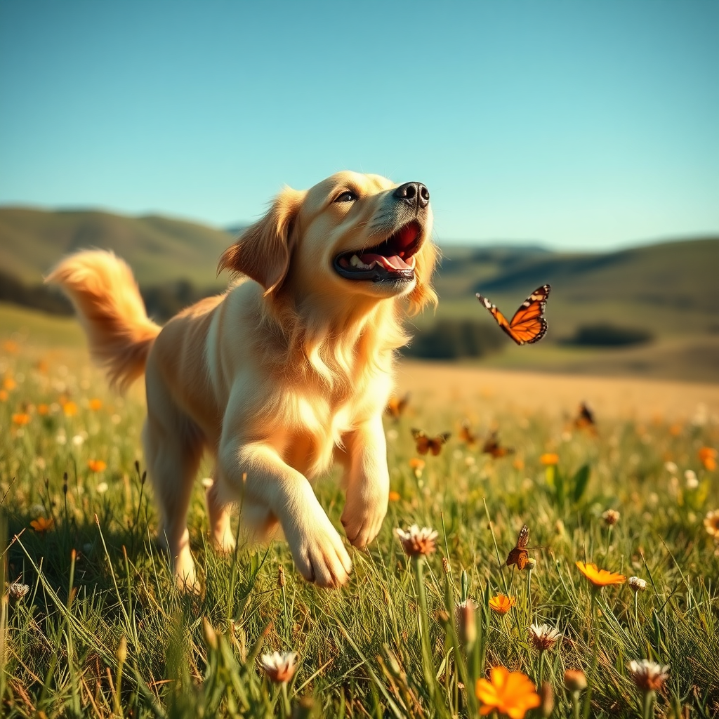 A serene snapshot capturing a playful golden retriever frolicking in a sun-drenched meadow, its fur shimmering in the warm afternoon light as it chases after vibrant butterflies, with a backdrop of lush, rolling hills under a clear blue sky.
